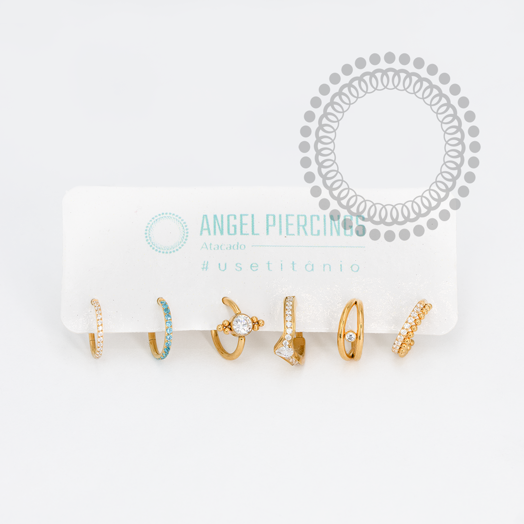 Descrição: Os kits promocionais Angel Piercings oferecem uma seleção exclusiva de joias, combinando estilo e qualidade, e um preço incrível. Cada kit é cuidadosamente elaborado para atender às necessidades de perfurações diversas. Os segmentos decorados são articulados com fechamento clicker, proporcionando uma fixação segura e prática. Essa característica facilita a colocação e remoção das joias, garantindo conforto e versatilidade no uso. Perfeito para profissionais piercers que desejam diversificar suas coleções.